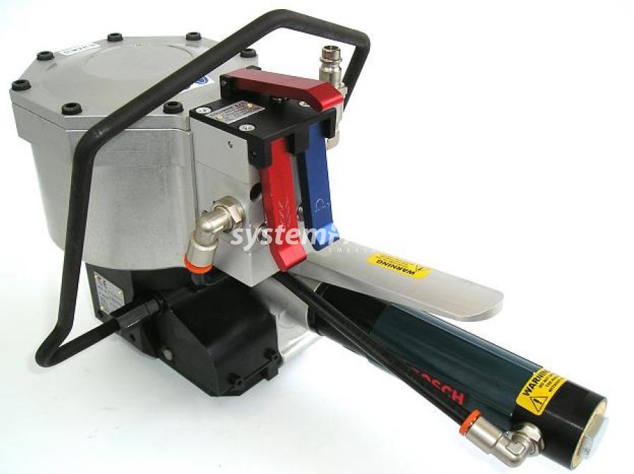 Herramienta zunchadora, flejadora manual, para flejes de acero para utilizar sin sellos. Realiza troquelado sobre el mismo fleje. Fabricada en Italia.